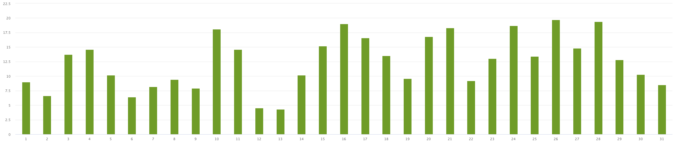 The worst generation day was the 13th with only 7.1 kWh and the best was the 26th when 32.9 kWh was generated.