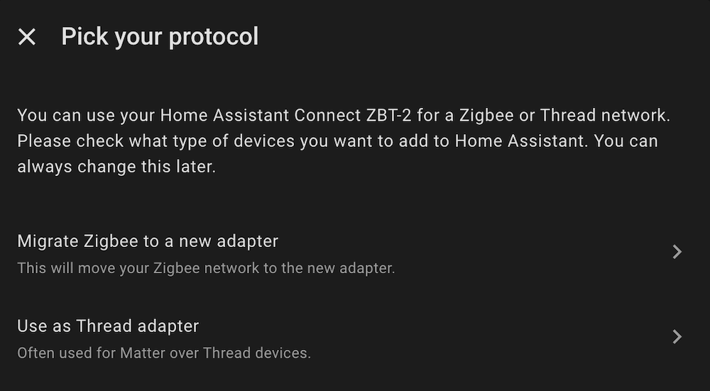 You have the option at this point to change the ZBT-2 to a Thread Border Router. I chose Zigbee
