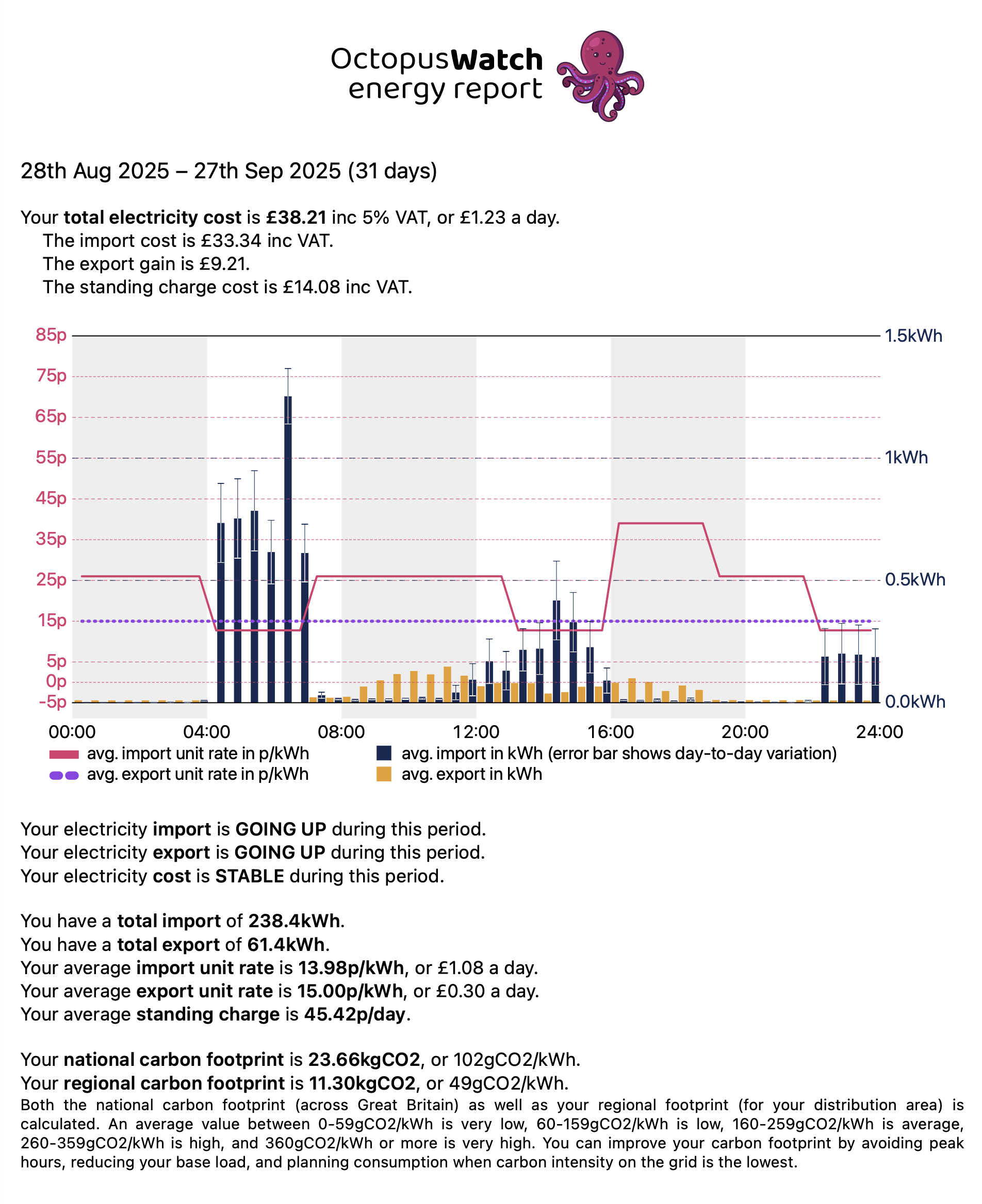 The costs shown here do include the standing charge. Any comparisons are compared to the unit cost if we were not on Cosy Octopus, which is 26.010p per kWh. The standing charge was 45.42p
