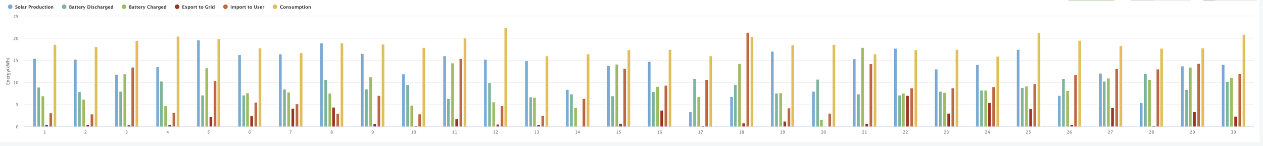 Showing generation, battery discharge, battery charging, export, import to use and consumption for 2025