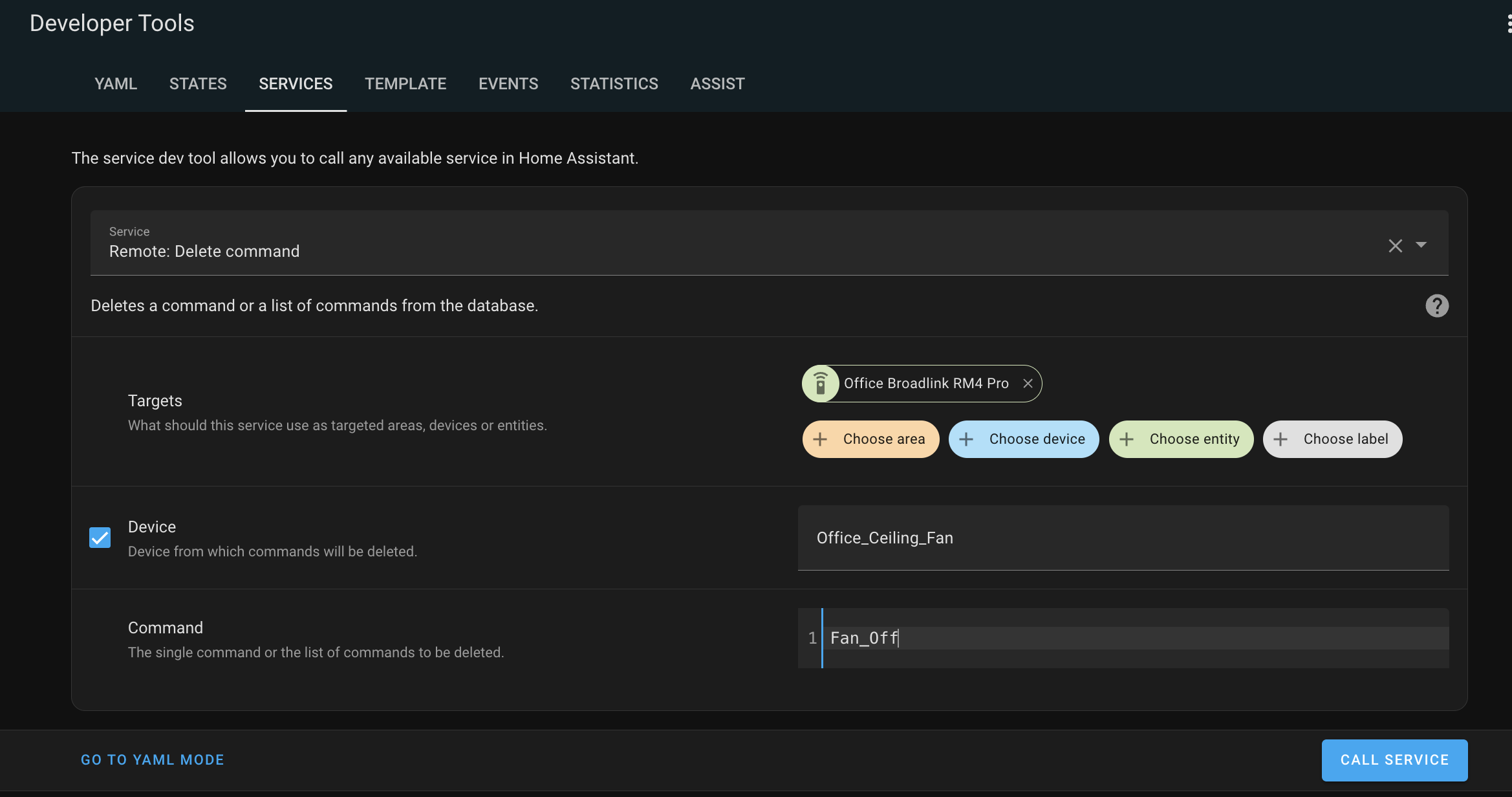 Now pick the Broadlink entity, enter your device name and the command you want to test. Press Call Service.